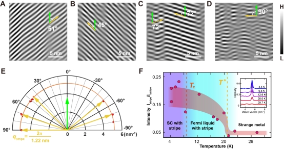 图1 (A-D) 不同方向的条纹电荷序。(E) 条纹电荷序的方向与波矢统计。(F)电荷序的温度演化及相图。T*为电荷序的相变温度。